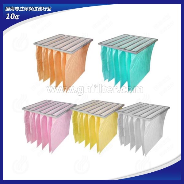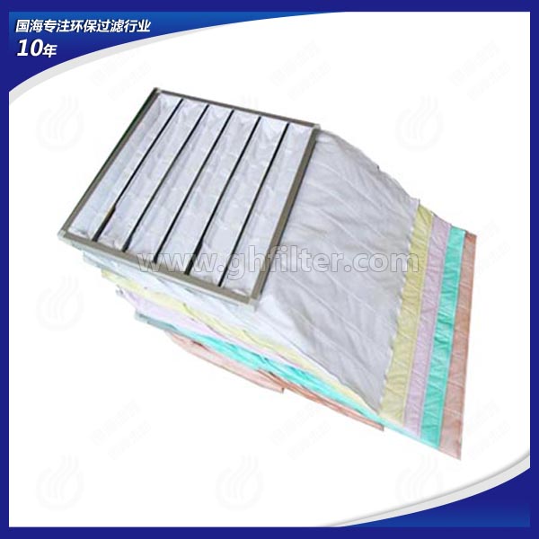 中央空調及通風系統前端通常會配有初效板式空氣過濾器與中效袋式空氣過濾器。初效板式空氣過濾器作為最前端的預過濾處理設備,主要過濾通風系統中5μm以上的粉塵粒子,而中效袋式空氣過濾器主要過濾通風系統中1-5μm的粉塵粒子懸浮物。中效袋式空氣過濾器與初效板式空氣過濾器在使用更換過程中有些相同,都在通風系統中具有阻力小,容塵量大,更換方便的特點,因此被很多行業所采用。袋式中效過濾器,可用于空調系統的中級過濾,以保護系統中下一級過濾器和系統本身,在對空氣凈化潔凈度要求不嚴格的場所,經中效過濾器處理后的空氣可直接送至用戶。鋁框袋式過濾器采用優質合成纖維或進口玻璃纖維為濾材,鋁合金型材外框,內部噴塑冷拔絲支撐架。國海袋式過濾器有效過濾面積大,容塵量大,阻力小,通風量大;框架及支撐架均可重復使用,更換過濾器時僅需更換過濾袋,且方便快捷,大大降低運行成本費用。廣泛應用于電子、制藥、醫療、食品等行業的過濾系統,是目前結構最好的中效過濾器。