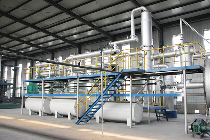 廢舊橡塑煉油設備工藝流程:將需要深加工的粗油通過油泵打入裂解鑵,再在常壓狀態下萃化加熱,餾出油氣,油氣經催化塔進入冷凝器,可液化部分冷凝為油,不可液化部分通過廢氣回收系統送入加熱系統燒掉。冷凝后的油進入油水分離器把水分離,較后進入精制鑵脫色去味生成成品油。